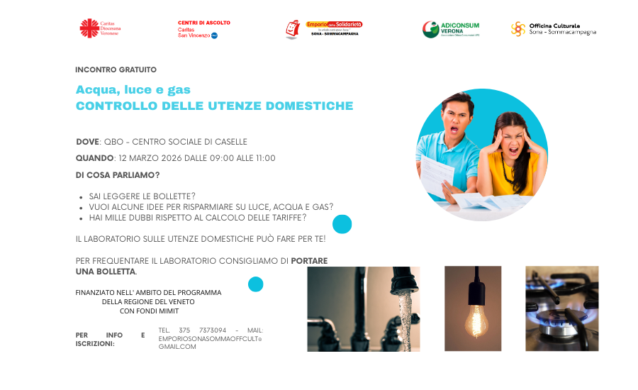 12 marzo 2026 – Officina culturale Sona-Sommacampagna – Incontro gratuito acqua, luce, gas – Controllo delle utenze domestiche