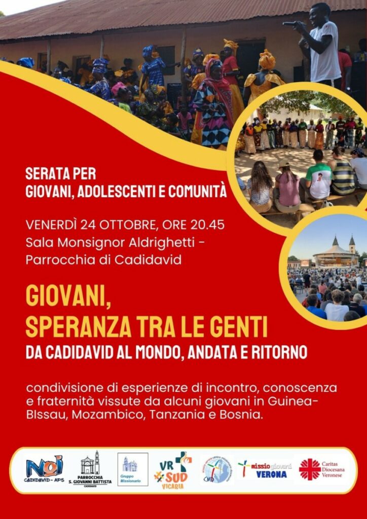 La parrocchia di Cadidavid, in collaborazione con Missio Giovani Verona e Caritas diocesana veronese, organizza una serata di animazione, conoscenza e fraternità venerdì 24 ottobre alle 20.45, dedicata al racconto dei viaggi estivi in missione e servizio vissuti dai giovani della diocesi di Verona.