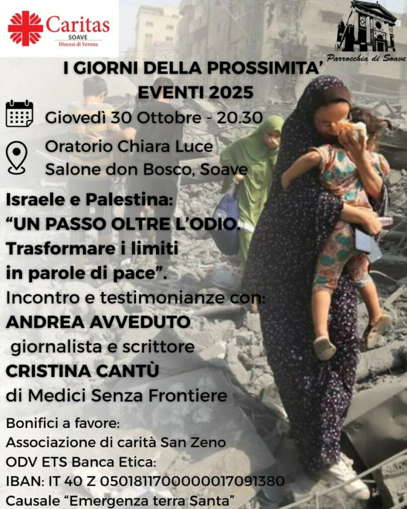 Giovedì 30 Ottobre, ore 20.30, Caritas Soave organizza l’incontro “Israele e Palestina: Un passo oltre l’odio. Trasformare i limiti in parole di pace.” Un momento di riflessione profonda e di prossimità verso le zone di conflitto, per cercare vie di dialogo e di speranza.