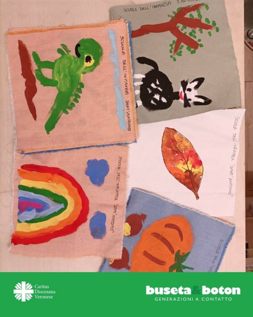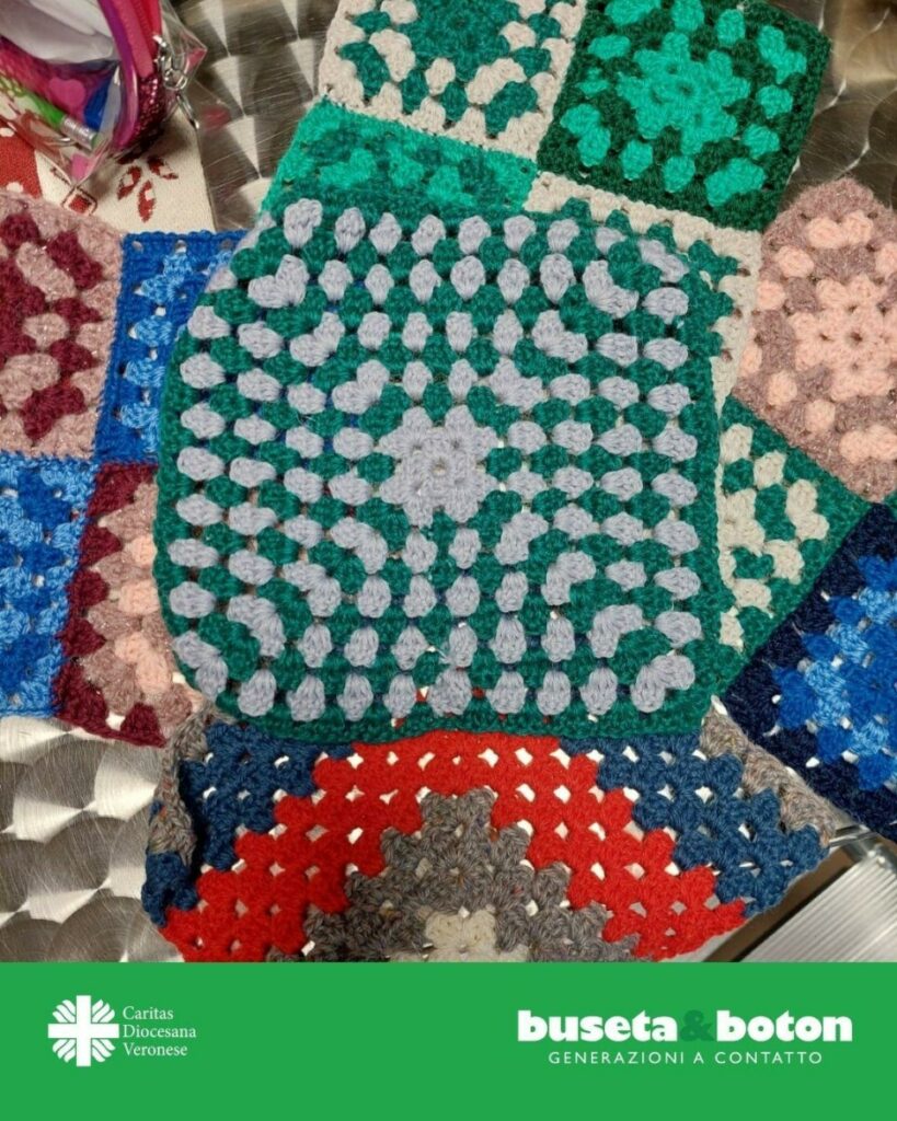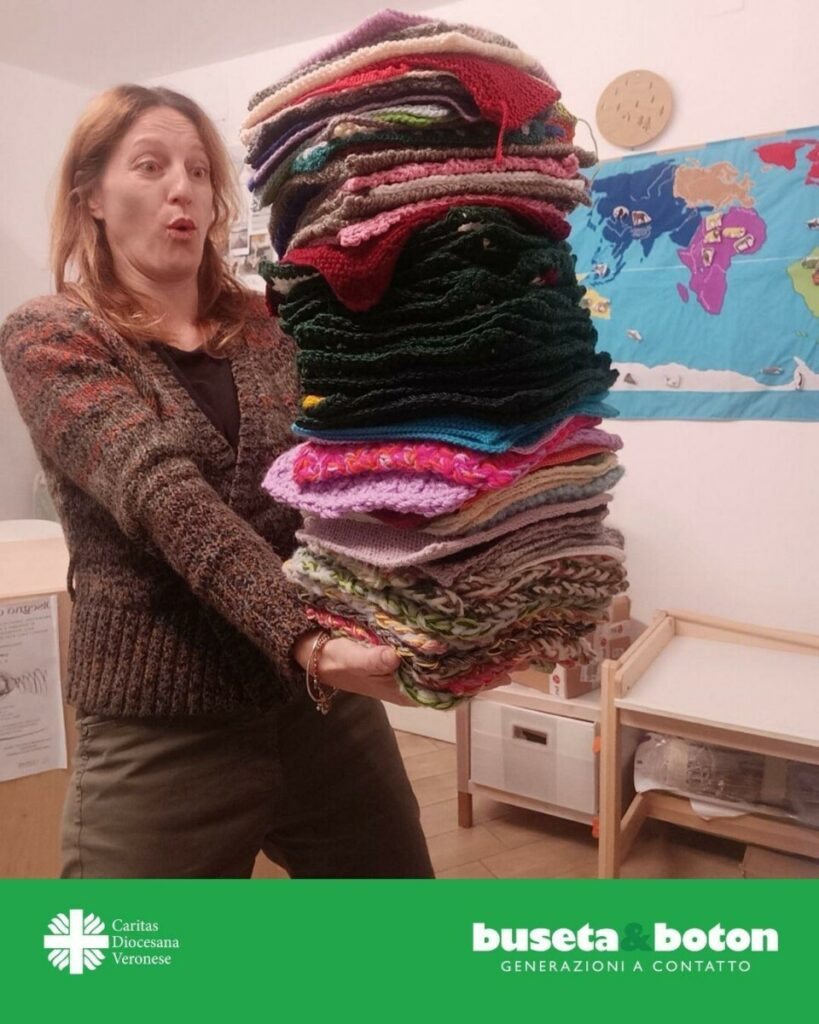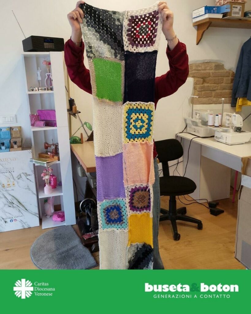 coordinamento ed organizzazione dell’iniziativa. Ringraziamo chi ha contribuito ad includere anche i più piccoli: alle volontarie della sartoria Caritas del Borgo della Vittoria, che hanno dedicato tempo e materiali nella preparazione di alcuni quadrati in cotone, poi dipinti dai bambini delle scuole; alle educatrici e ai bambini del Nido Alice e Tamburino; alle nonne, i genitori e gli alunni della scuola primaria San Peretto di Negrar; alle insegnanti e ai bambini delle scuole dell’infanzia Rodari, Gambaro, Santa Lucia e Sant’Antonio; ad insegnanti e ragazzi della scuola primaria Salvo D’Acquisto. Un grazie di cuore a tutti coloro che hanno partecipato, donando tempo, abilità e affetto. Tante sono state le donazioni di quadrati da singoli o gruppi più o meno informali, anche al di fuori del paese: grazie alle operatrici e agli anziani della Casa di riposo San Giuseppe di San Martino; alle volontarie dell’emporio dell’abbigliamento Caritas del Borgo. Grazie al gruppo di partecipanti del corso di yoga di San Briccio; ai dipendenti comunali; a chi ha sferruzzato ed inviato quadrati da Zevio e comuni limitrofi. Grazie a Sabrina di Sabrina Shopping Therapy per l’entusiasmo e l’aiuto nella raccolta, ed a tutti coloro che hanno recapitato i propri quadrati nei punti di raccolta e nelle parrocchie di Mambrotta, Marcellise, Ferrazze e Borgo della Vittoria. Ringraziamo quindi i sacerdoti dell’unità pastorale per il sostegno e la parrocchia di S. Martino Vescovo che ha messo a disposizione lo spazio espositivo per il mantello. Un grande grazie lo dobbiamo alla sarta Lisa Petraccini del Laboratorio sartoriale LP, che con abilità e pazienza ha unito i quadrati raccolti. Grazie anche ad Isabella e a tutti i volontari e i partner del progetto Buseta & Boton per aver sostenuto ed