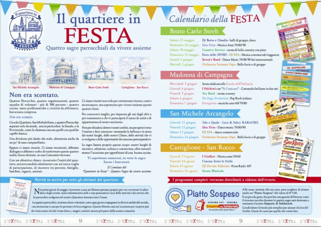Sarà una festa di comunità, ma anche un’occasione per prendersi cura degli altri. Nell’ambito de “Il quartiere in Festa”, che unisce le parrocchie di San Michele Arcangelo, Madonna di Campagna, Beato Carlo Steeb e Castiglione – San Rocco, trova spazio anche un’iniziativa dal forte valore sociale: il “Piatto sospeso” a sostegno dell’Emporio della Solidarietà Verona Est.