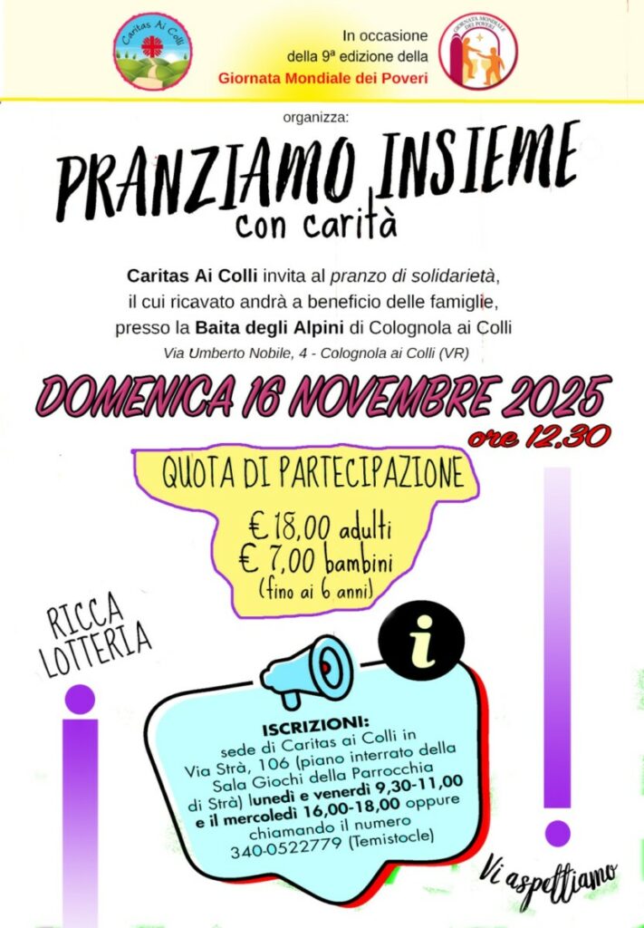 In occasione della 9° Giornata dei Poveri, Caritas Ai Colli organizza un pranzo di solidarietà il cui ricavato andrà a beneficio delle famiglie supportate dalla Caritas stessa.